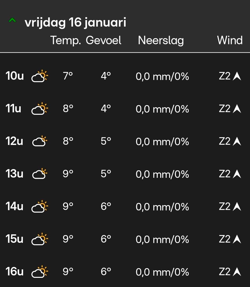 Geen auto rit naar de Pyreneeën maar een fiets ritje door het vlakke Nederland -- myWindsock Report -- Weather Impact™: 3% Headwind: 52% @ 3.1 - 3.5 m/s Longest Headwind: 01h 32m 36s Air Speed: 27.6 km/h Temp: 18-21.1 °C Precip: 0% @ 0 Inch/hr -- END --